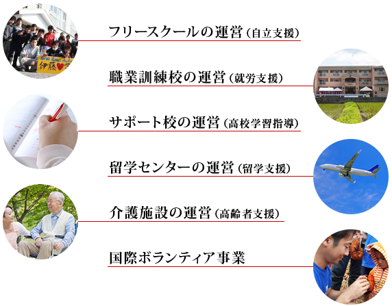 不登校、非行、ひきこもりなど様々な問題を抱え、居場所を失った若者と向き合い立ち直りを支援する活動を行っています。現在は、全国にフリースクール、職業訓練施設などを展開し、小学生から成人者まで幅広いサポートを行っています。